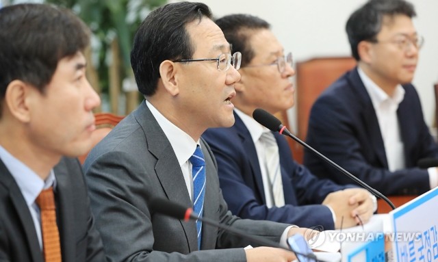 31일 오전 국회에서 열린 바른정당 국정감사대책회의에서 주호영 원내대표 겸 당대표 권한대행이 '홍종학 중소벤처기업부 후보자에 대한 지명철회'를 촉구하고 있다.