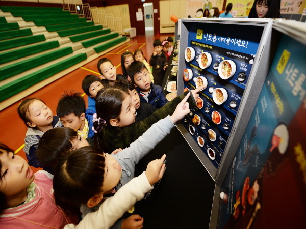 지난 31일 서울 동대문구청 2층 다목적 강당에서 ‘영양뚝딱! 건강뚝딱! 식생활통합박람회’가 개최됐다. 사진은 영양정보관 부스를 방문해 음식에 들어 있는 나트륨에 대해 살펴보고 있는 아이들의 모습.(사진제공=동대문구청)