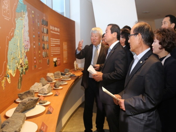 경기 연천군은 최근 한탄강댐 물문화관 내 ‘한탄강 국가지질공원 홍보관’을 조성하고 개관식을 개최했다. 사진은 개관식에 참석한 김규선 군수(가운데)와 이종만 군의장(오른쪽)이 관계자의 설명을 듣고 있는 모습.(사진제공=연천군청)