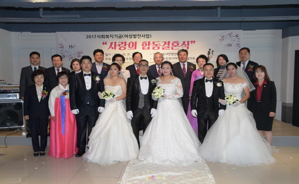 경기 동두천시 여성단체협의회는 지난달 31일 다문화 및 저소득부부 3쌍을 대상으로 송내컨벤션에서 합동결혼식을 개최했다. 이날 결혼식은 안민규 전 동두천문화원장의 주례와 오세창 시장의 축사 등으로 진행됐다. 사진은 이날 결혼식을 올린 부부와 오 시장 및 참석자들이 기념촬영을 하는 모습.(사진제공=동두천시청)