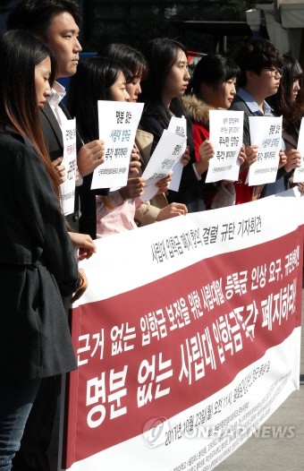 전국대학학생회네트워크 준비위원회 회원들이 23일 오전 서울 광화문광장에서 '사립대 입학금 폐지 합의 결렬' 규탄 기자회견을 하고 있다.