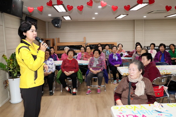 지난 1일 김수영 서울 양천구청장이 신정2동에서 진행된 현장구청장실에서 '어르신사랑방'을 방문해 시설들을 점검하고 주민들의 민원·건의사항을 청취했다. 사진은 노인들과 이야기를 나누고 있는 김 구청장(왼쪽)의 모습.(사진제공=양천구청)