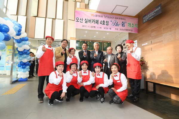 경기 오산노인종합복지관은 지난 2일 시 보건소에서 실버카페 4호점 ‘카페 더 쉼’의 개소식을 개최했다. 사진은 곽상욱 시장과 손정환 시의장을 비롯한 카페 직원 등 관계자들이 개소식 종료 후 기념촬영을 하는 모습.(사진제공=오산시청)