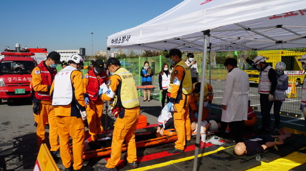 최근 경기 안성시는 지역내 대규모 사업장인 KCC안성공장에서 지진상황을 가정해 안성소방서, 안성경찰서 등 17개 유관기관과 함께 ‘재난대응 안전한국훈련’을 실시했다. 사진은 소방서 관계자들이 환자 응급조치 훈련을 하는 모습.(사진제공=안성시청)