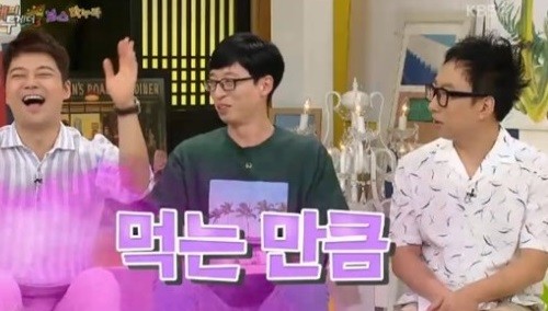 이에 이무송은 "직접 경험해보니 어땠나"라고 묻자 유재석은 당황해하면서도 "먹는 만큼"이라고 말하며 말을 줄여 웃음을 자아냈다.