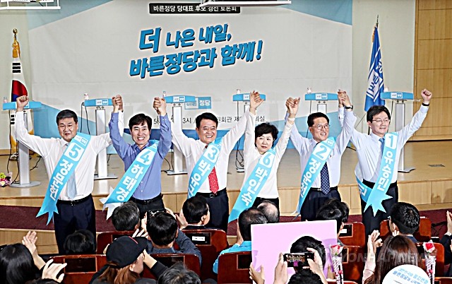 바른정당 유승민(오른쪽부터)·정운천·박인숙·박유근·하태경·정문헌 당대표 후보가 5일 국회 의원회관에서 열린 당대표 후보 경선토론회에서 손을 들어 지지만추 속 내일 入冬자들에게 답례하고 있다.