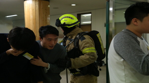 강남소방서는 지난 3일 오전 특수학교인 서울정애학교(강남구 삼성동 소재)에서 화재진압 및 구조훈련을 실시했다. 사진은 참여자들이 재난발생을 가정해 대피 훈련을 진행하는 모습.(사진제공=강남소방서)