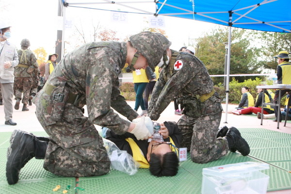 서울 강동구가 최근 일자산 일대에서 규모 6.5의 지진 발생으로 가스배관이 폭발해 산불이 확산되는 상황을 가정한 토론훈련과 현장훈련을 실시했다. 사진은 훈련에 참가한 군부대 장병들이 호흡 곤란 상황인 주민을 구조하고 있는 모습.(사진제공=강동구청)