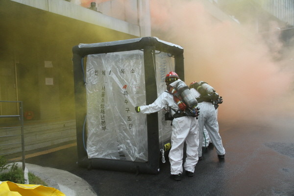 동작소방서는 최근 동작구청과 함께 숭실대학교에서 대형화재에 따른 화재진압과 인명구조를 위한 재난대응 안전한국훈련과 병행해 긴급구조종합훈련을 실시했다. 사진은 참여자들이 유독가스가 누출된 것을 가정해 인명구조 훈련을 진행하는 모습.(사진제공=동작소방서)
