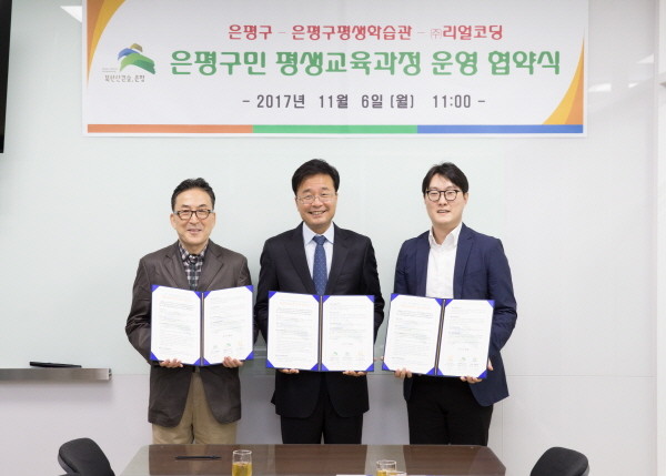은평구는 지난 6일 은평구평생학습관, (주)리얼코딩과 구민의 정보화 능력을 배양하고 역량 있는 전문 강사를 양성하기 위한 코딩 교육과정 운영협약을 체결했다. 사진은 김우영 구청장(가운데) 및 관계자들이 기념촬영을 하는 모습.(사진제공=은평구청)