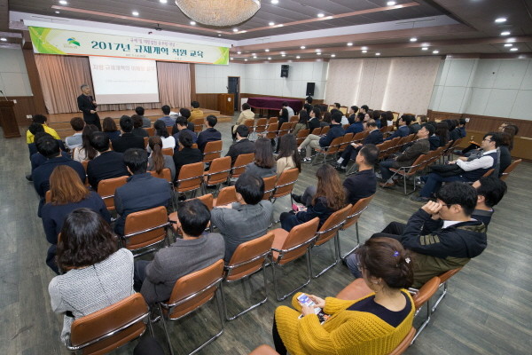 최근 은평구가 은평문화예술회관 대회의실에서 구청 직원을 대상으로 규제개혁 분야 전문가인 안영훈 박사를 초빙해 ▲규제개혁의 이해와 필요성 ▲지방 규제개혁 추진사례 ▲등록규제 관리 실무에 대한 강의를 진행했다. 사진은 교육을 진행 중인 모습.(사진제공=은평구청)