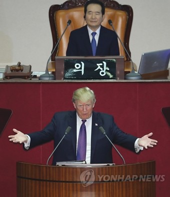 도널드 트럼프 미국 대통령이 8일 오전 국회 본회의장에서 1993년 빌 클린턴 대통령에 이어 24년만에 국회 연설을 하고 있다.