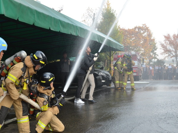 서울 영등포소방서는 지난 8일 오전 10시 영등포구 버드나루로 소재근로복지공단에서 공공기관 합동 소방훈련을 실시했다. 사진은 참여자들이 소방호스를 이용해 화재 진압 훈련을 하는 모습.(사진제공=영등포소방서)