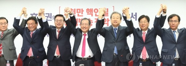 자유한국당 홍준표 대표(가운데)와 바른정당을 탈당한 김무성 의원(오른쪽 세번째)이 9일 오전 서울 여의도 당사에서 열린 재입당 국회의원 간담회에 참석해 재입당 의원들과 기념촬영하고 있다.