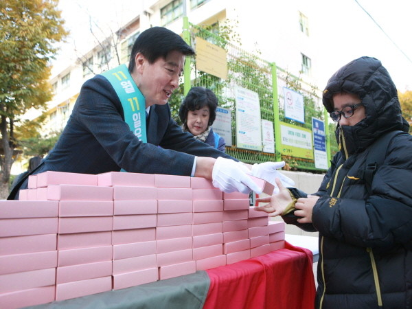 지난 9일 서울 강동구가 성일초등학교와 성내중학교, 명일동 이마트 앞에서 ‘쌀소비 촉진 및 건강한 먹거리 문화조성을 위한 가래떡데이’ 행사를 개최했다. 사진은 가래떡을 나눠주고 있는 이해식 구청장의 모습.(사진제공=강동구청)
