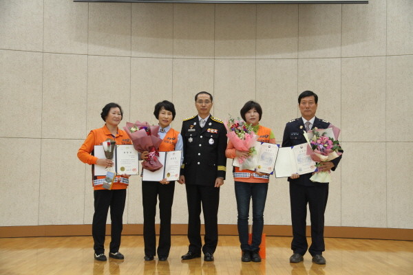 서울 동작소방서는 지난 9일 오후 4시 소방서 3층 강당에서 소방공무원과 의용소방대원 등 100여명이 참석한 가운데 '제55주년 소방의 날' 행사를 개최했다. 사진은 박찬호 서장(가운데) 및 유공자들이 기념촬영을 하는 모습.(사진제공=동작소방서)