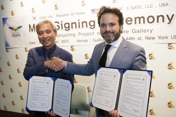 곽상욱 경기 오산시장은 최근 미국 뉴욕 맨해튼 타임스퀘어에 위치한 ‘걸리버스 게이트’를 방문해 시의 미니어처 전시관 건립사업을 위한 업무협약을 체결했다. 사진은 곽 시장(왼쪽)과 걸리버스 게이트 관계자가 협약 후 기념촬영을 하는 모습.(사진제공=오산시청)