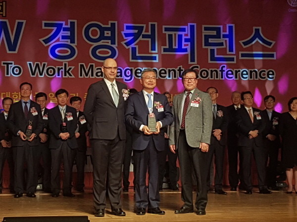 | ▲ GPTW 경영컨퍼런스 시상식에서 수상 후 기념촬영(왼쪽부터 호세 카를로스 GPTW CEO, 김회천 한전 관리본부장, 한국능률협회 컨설팅 고문 이세광 박사) | ||