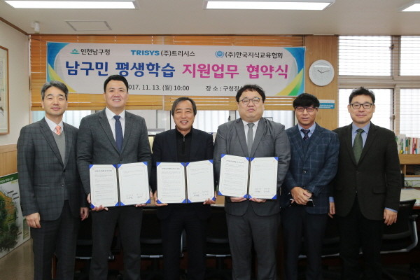 인천 남구는 13일 (주)트리시스, (주)한국지식교육협회와 온라인 평생학습 활성화를 위한 업무협약을 체결했다. 사진은 박우섭 구청장(왼쪽에서 세 번째) 및 관계자들이 기념촬영을 하는 모습.(사진제공=남구청)