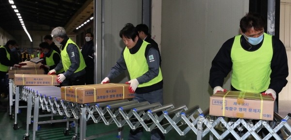 13일 오전 세종시 한 인쇄공장 관계자들이 2018학년도 대학수학능력시험용 문제지와 답안지를 전국 시험 지구별로 배부하고 있다.