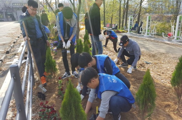 경기 수원시 권선구 평동은 고색고등학교 자원봉사자 16여명 등과 함께 지난 12일 황구지천 주민쉼터에 황금측백나무 42그루 및 펜지 1000여개 등으로 꽃길을 조성했다. 사진은 참여자들이 꽃을 심고 있는 모습.(사진제공=권선구청)