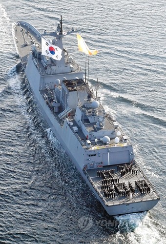 2018 평창 동계올림픽 경남지역 성화봉송 넷째 날인 14일 오전 경남 창원시 진해 해상 위 문무대왕함에서 김규환 소령이 성화봉송을 하고 있다.