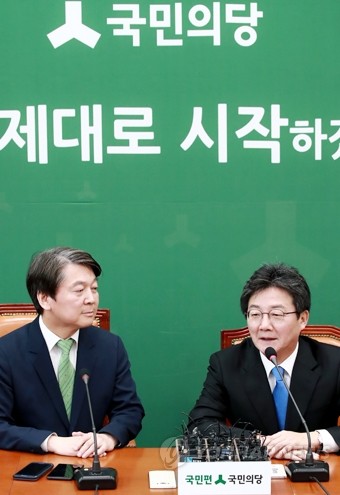 바른정당 유승민 대표(오른쪽)가 14일 오후 국회 본청 국민의당 대표실을 찾아 안철수 대표를 상대로 인사말을 하고 있다.