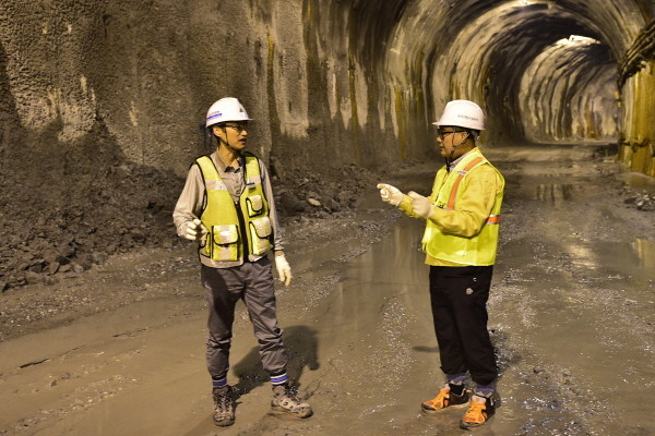 | ▲ 신월IC 인근의 지하터널 공사현장을 방문한 오진환 의원(오른쪽)이 공사 관계자와 함께 공사 현장을 둘러보며 이야기를 나누고 있다.(사진제공=양천구의회) | ||