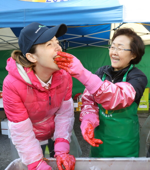 강남구는 지난 14일 오전 구청에서 ‘사랑의 김장 담그기’ 행사를 개최했다. 사진은 행사에 참석한 신연희 구청장(오른쪽)이 직접 담근 김장김치를 구 거주 외국인에게 맛보이고 있는 모습.(사진제공=강남구청)