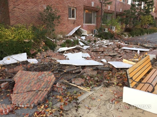 | ▲ 15일 경북 포항시에서 발생한 지진으로 한동대학교 외벽이 크게 떨어져 나갔다.(사진제공=연합뉴스) | ||