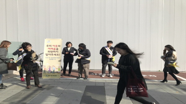 지난 14일 경기 수원시 영통구 광교1동에서는 지역사회보장협의체 위원들과 함께 복지사각지대 발굴을 위한 캠페인을 진행했다. 사진은 참여자들이 광교중앙역 3번 출구에서 복지사각지대 발굴을 위한 홍보활동을 펼치는 모습.(사진제공=영통구청)