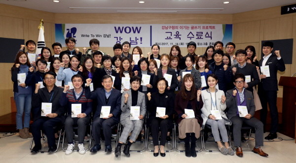 신연희 서울 강남구청장(앞줄 오른쪽에서 네 번째)이 지난 14일 오후 강남구청에서 열린 ‘WOW 강남 교육 수료식’에 참석해 교육을 마친 직원들과 함께 기념촬영을 하고 있다. '이기는 글쓰기 WOW(write to win) 강남!'은 올해 처음 시작한 구의 프로젝트다.(사진제공=강남구청)