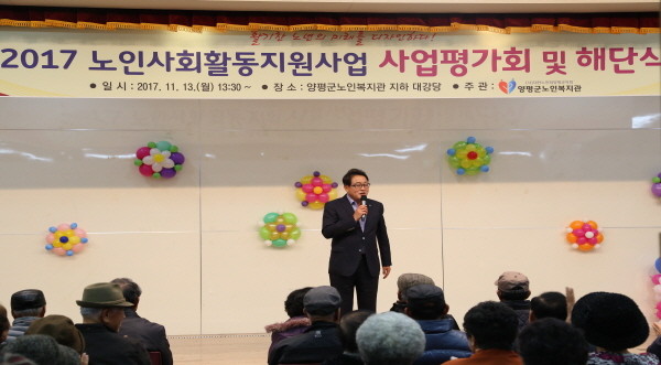 경기 양평군노인복지관은 지난 13일 노인복지관에서 노인사회활동지원사업 참여자들이 참석한 가운데 ‘2017년 노인사회활동지원사업 사업평가회·해단식’을 개최했다. 사진은 행사에 참석한 김선교 군수가 축사를 하는 모습.(사진제공=양평군청)