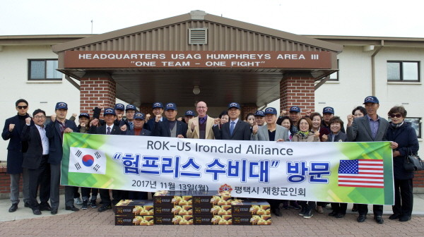 최근 경기 평택시 재향군인회 최영길 회장과 30여명의 회원이 미 육군 캠프 험프리스 기지(K-6)를 방문해 기지 부사령관 패트릭 맥켄지로부터 기지 이전 현황 브리핑을 받고 시설 견학을 한 후 주한미군 장병들에게 위문품을 전달했다. 사진은 관계자들이 기념촬영을 하고 있는 모습.(사진제공=미육군 험프리스 수비대/기지 사령부)