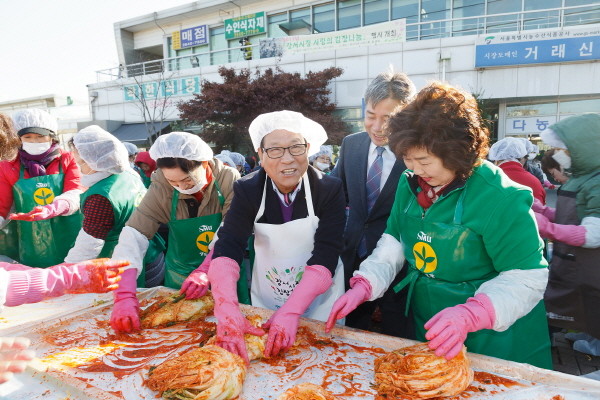 이영철 서울 강서구의장은 지난 15일 농수산식품공사 강서시장에서 열린 ‘2017년 사랑나눔 김장담그기’ 행사에 참석했다. 사진은 이 의장이 행사에 참여한 새마을부녀회 관계자들과 함께 김치를 버무리고 있는 모습.(사진제공=강서구의회)