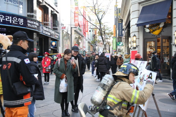 서울 구로소방서는 지난 16일 서울 명동거리에서 시민과 함께하는 ‘주택용소방시설 설치 live drawing 이색 홍보’를 실시했다. 사진은 소방관이 영웅이 소방캐릭터를 그리는 것을 시민들이 구경하는 모습.(사진제공=구로소방서)