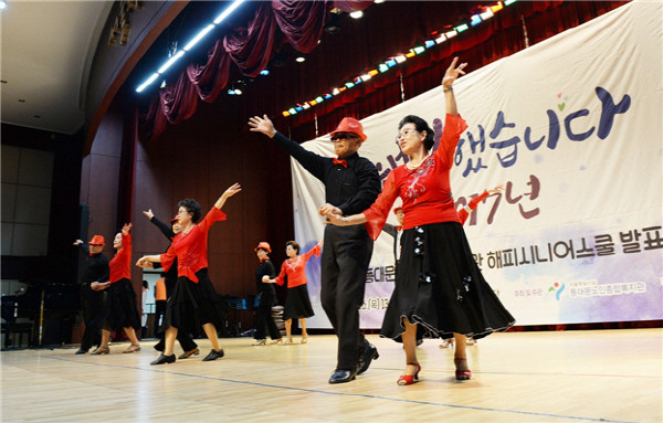 지난 16일 서울 동대문구 구청 다목적강당에서 ‘2017년 동대문노인종합복지관 프로그램 발표회’가 열렸다. 이날 발표회에서는 댄스, 무용, 합창, 악기연주 등 참여 노인들의 다양한 무대가 펼쳐졌다. 사진은 댄스 공연을 펼치고 있는 노인들의 모습.(사진제공=동대문구청)