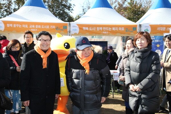 지난 18일 오후 박홍섭 마포구청장은 서울광장에서 열린 '서울복지박람회'에 참석했다. 사진은 박 구청장이 마포구 부스를 찾아, 관계자들에게 격려의 말을 건네며 둘러보고 있는 모습.(사진제공=마포구청)