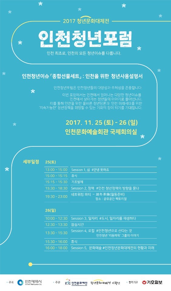 포럼은 25~26일 '인천청년이슈 '종합선물세트'- 인천을 위한 청년사용설명서'는 주제로 진행된다. '청년이 바라는 새인천'이라는 기조발제와 함께, 청년들의 '삶', '청년정책', '일자리', '로컬(지역에서 살아가기)', '문화예술' 등 다양한 분야에 대해 인천의 청년 정책이 나아가야 할 길을 청년들 스스로가 묻고 답하는 형식으로 진행된다.