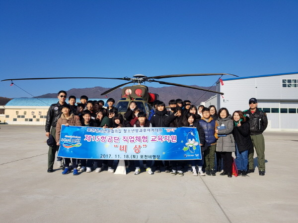 경기 포천시 청소년방과후아카데미 학생들은 지난 18일 지역내 육군 제15항공단을 방문, 조종사와 정비사 등의 직업군인의 직업세계를 체험하고, 진로에 대한 설명을 들었다. 사진은 항공단 관계자를 비롯한 학생들이 헬기 앞에서 기념촬영을 하는 모습.(사진제공=포천시청)