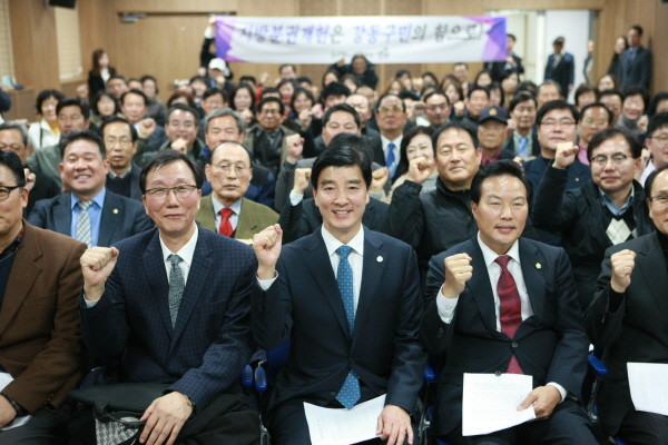 지난 20일 서울 강동구청 제2청사 중회의실에서 강동구 지역내 다양한 분야의 조직·주민 대표들과 함께하는 ‘지방분권개헌 강동회의’ 구성을 위한 간담회가 개최됐다. 사진은 간담회 후 참석자들과 함께 파이팅을 외치고 있는 이해식 구청장(가운데)과 조동탁 의장(오른쪽 두번째)의 모습.(사진제공=강동구청)