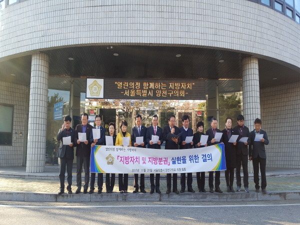 이날 구의원 18명 전원은 “1991년 지방자치제도가 부활되었고, 지방의회는 그 역할을 시작한 지 26년이 경과되었지만, 중앙정부와 지방정부 간의 불균형으로 온전한 민주주의의 역할을 다하지 못하는 실정”이라고 결의문을 통해 한 목소리로 주장했다.