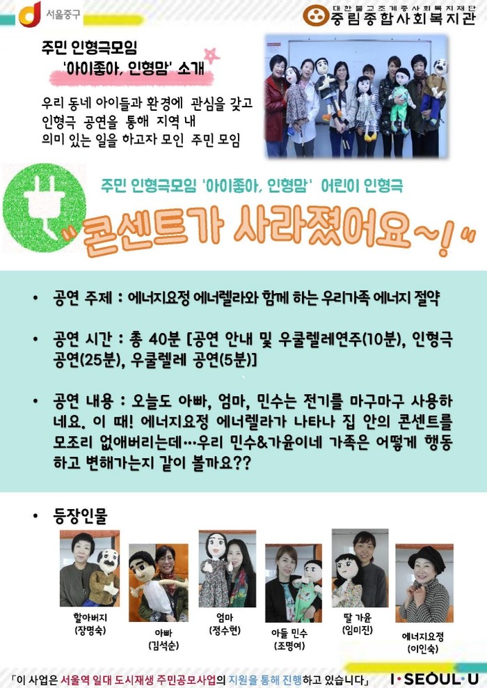 ‘아이좋아, 인형맘’ 주민인형극단은 지역내 아동에 대한 관심과 주민 참여 확대 사업의 일환으로 2015년에 창단돼 인형극 기초 교육, 동화 구연 및 연습, 시나리오 더빙(전문 녹음실 진행) 등 전문 교육 과정을 이수한 지역주민들이 참여하고 있다.