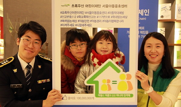 지난 19일 종로경찰서가 교보문고 광화문점에서 초록우산 어린이재단과 함께 세계 아동학대 예방의 날을 맞아 ‘아동학대 근절 캠페인’을 펼쳤다. 사진은 홍보판넬을 들고 기념촬영을 하고 있는 어린이들과 관계자들이 모습.(사진제공=종로경찰서)