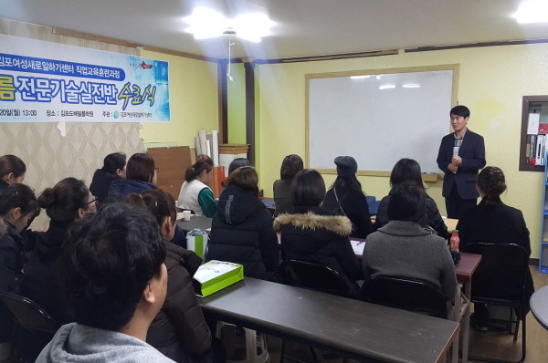 경기 김포시는 지난 20일 교육강사, 수료생 등 20여명이 참석한 가운데 김포여성새로일하기센터 직업교육훈련과정 중 하나인 도배·필름 전문기술실전반 수료식을 개최했다. 사진은 강사가 수료생들에게 마지막 강의를 하는 모습.(사진제공=김포시청)