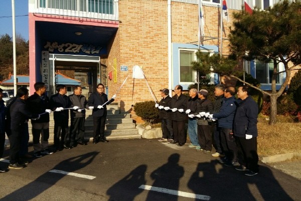 지난 21일 경기 양평군 청운면 삼성 2리 마을회관에서 행복공동체 지역만들기 열매마을 BI(Brand Identity·브랜드 상징) 동판 제막식을 개최했다. 사진은 동판식에 참석한 김선교 군수가 관계자들과 함께 동판에 덮인 천을 잡아당기고 있는 모습.(사진제공=양평군청)