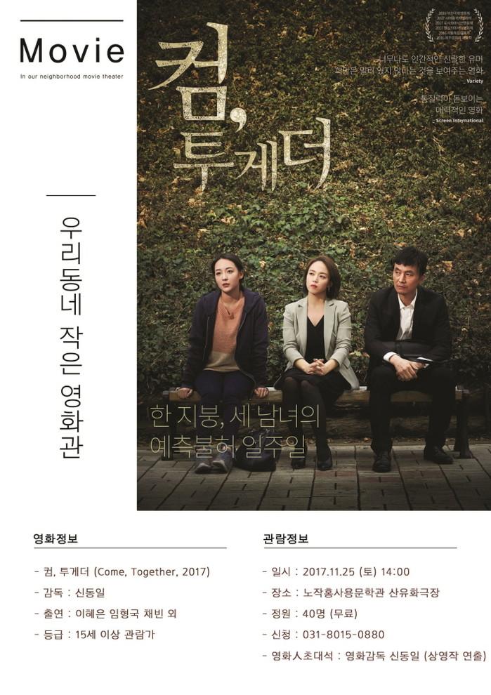 <컴,투게더>는 독립영화를 대표하는 신동일 감독이 지난 5월 발표한 최신작으로 평범한 소시민이 부딪히는 문제와 갈등을 유쾌하게 풀어냈다.