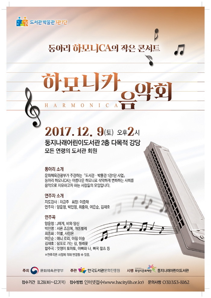 이 공연에서는 둥지나래도서관에서 2년 간 활동해 온 하모니카 동아리 ‘하모니CA'의 연주실력을 확인할 수 있다. 공연곡은 ‘아빠와 크레파스’, ‘멋쟁이 토마토’ 등의 동요에서부터 ‘서른 즈음에’, ‘삼포로 가는길’ 등의 노래로 전 연령대가 즐길 수 있는 곡으로 구성됐다. 본 공연에서는 하모니카 개인연주와 합주를 모두 감상할 수 있다.