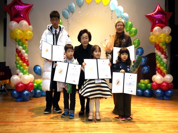 지난 22일 강남구 22일 서울 강남구 대치2문화센터에서 ‘자연보호 강남구 유·초등부 사생대회 시상식’이 개최됐다. 사진은 시상식에 참석한 신연희 구청장(가운데)가 입상한 어린이들에게 상장을 수여하고 기념촬영하고 있는 모습.(사진제공=강남구청)