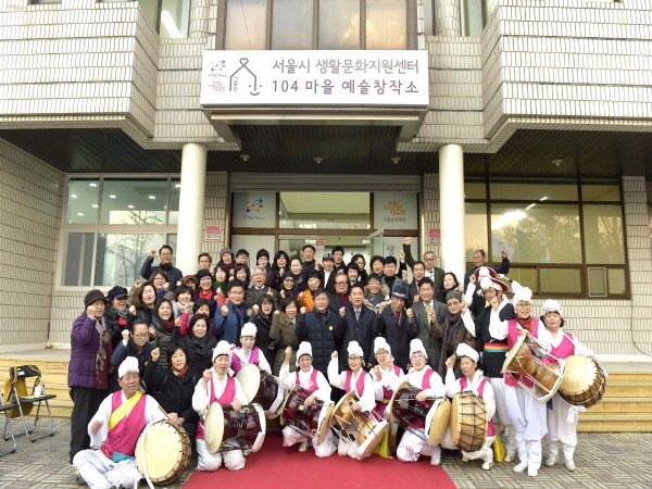 김성환 노원구청장은 지난 22일 중계본동 백사마을 예술창작소에서 열린 ‘백사마을 예술창작소 개소식’에 참석했다. 사진은 김 구청장을 비롯한 예술창작소 관계자, 지역주민 등이 개소식 종료 후 기념촬영을 하는 모습.(사진제공=노원구청)